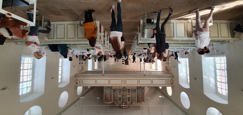 Nach vielen Erlebnissen und neuen Erfahrungen sitzen alle zum Abschluss am späten Nachmittag wieder in der Kirche. Stolz präsentieren die Gruppen ihre Ergebnisse. Eine Erfahrung prägt die Teilnehmenden, die trotz des Abstands doch Gemeinschaft erfahren konnten: Jede und jeder hat großartige Talente, die andere wiederum begeistern. Gut, dass wir so wunderbar gemacht sind! Zum Abschuss gibt es einen Segen zum Mitmachen und ein Segensarmband als Erinnerung an diesen unvergesslichen Tag. Diakonin Frauke Laging bedankt sich herzlich bei allen Referentinnen und Referenten, die die Gruppen aufmerksam, interessiert und mit tollen Impulsen begleitet haben. Als Erinnerung gibt es für sie einen Playmobil-Luther. Nach dem traditionellen Gruppenfoto – diesmal in der ganzen Kirche verteilt – ist der Abschied gekommen und mit ihm der Wunsch, sich im nächsten Jahr gesund wieder zu sehen.